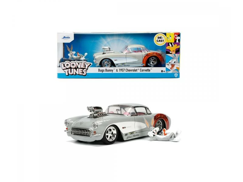 Bugs Bunny hat diese 1956er Chevy Corvette inspiriert und Sie können ihn nun in Ihre Sammlung aufnehmen. Dieses Die-Cast-Fahrzeug wurde für Bugs gemacht, da die glatte weisse Seitenwand seinen pelzigen weissen Bauch nachahmt. Logos und Aufkleber zieren das Fahrzeug und die Reifen. Das Fahrzeug wurde aus hochwertigem, schwerem Metalldruckguss gefertigt und verfügt über funktionierende Räder, hochwertige Gummireifen, eine zu öffnende Motorhaube, Türen und einen Kofferraum sowie eine zu 100% aus Zinkdruckguss gefertigte Bugs Bunny-Figur.