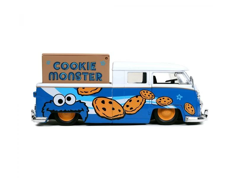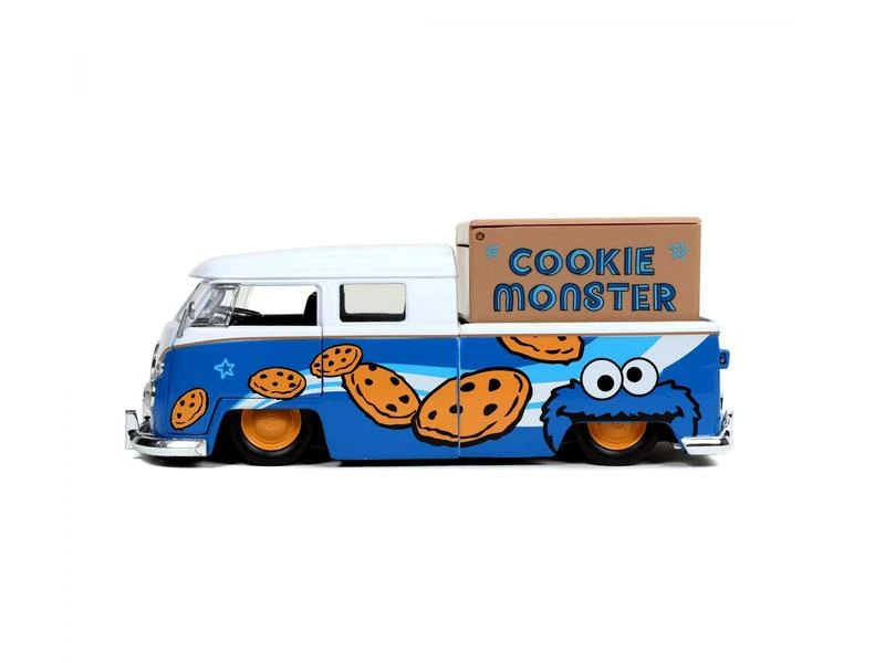 Dieser Volkswagen Bus Pick Up aus dem Jahr 1963 hat sich das Styling des Keks-Kenners zum Vorbild genommen. Mit zu öffnendem Fenster, Türen, hinterem Motorraum und einem Staukasten auf der Ladefläche. Dieses Fahrzeug enthält ausserdem eine sprechende 7 cm grosse-Cookie-Monster-Sammelfigur aus Zinkdruckguss und ist mit Sicherheit ein Highlight in jeder Sesamstrassen-Sammlung.